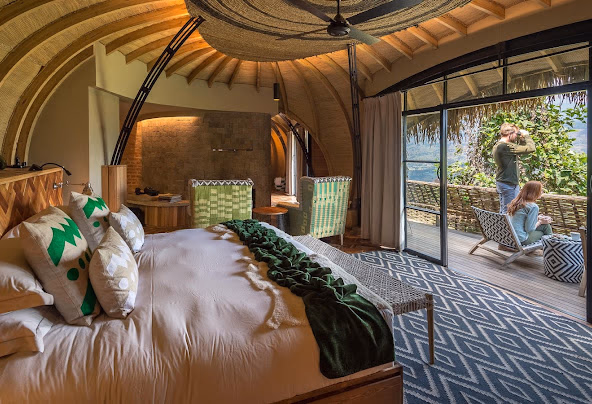 Most guests arrive via a 2.5-hour road transfer from Kigali or a 25-minute helicopter flight directly to the camp’s helipad.