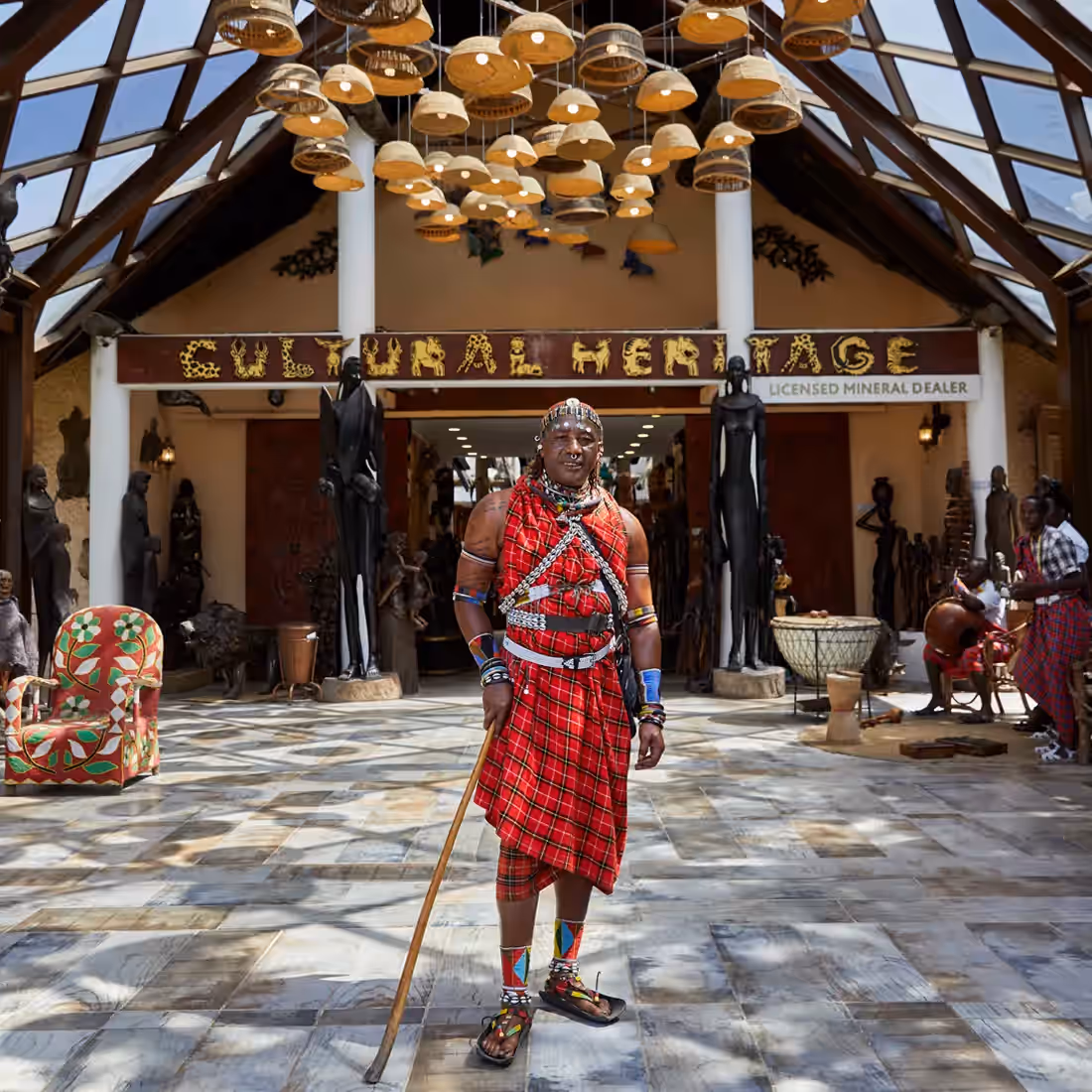 Step into a vibrant local market in arusha, filled with handcrafted jewelry, wood carvings, african-print fabrics, and paintings. accompanied by a gui...
